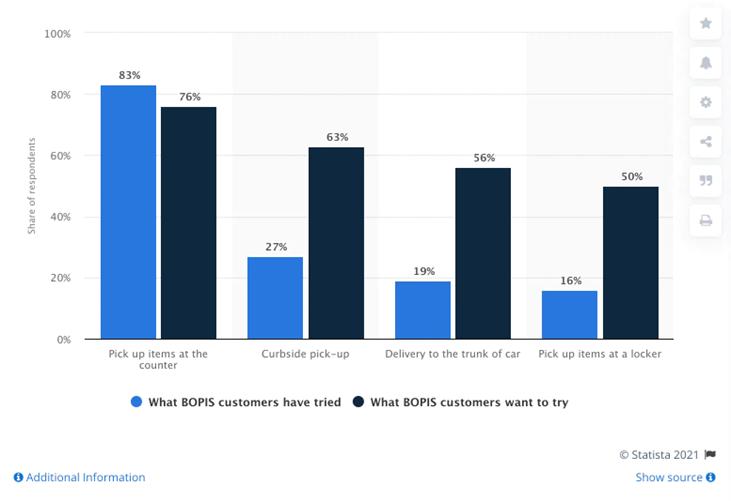 Also, according to Statista, 83% of respondents bought items online and picked them up at the counter in 2019. 63% of respondents said they wanted to try the buy online, pick up in-store service option of a curbside pickup.