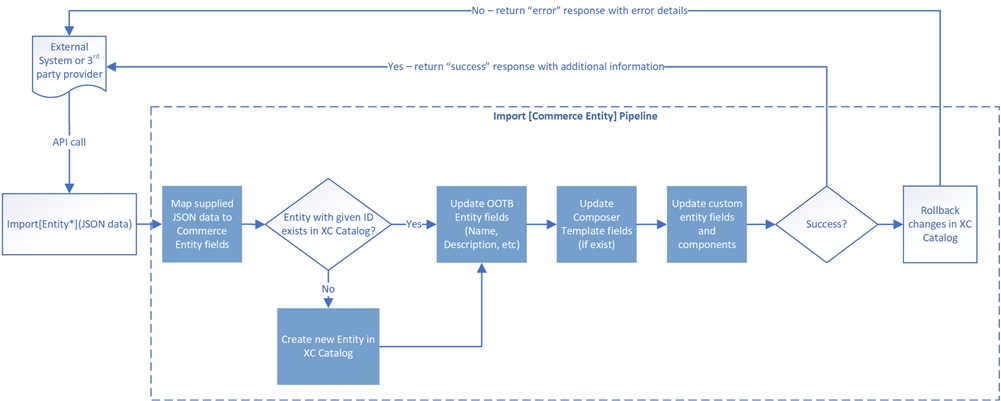 The Sync Plugin adds custom APIs to enable the import of products, product variants and categories into the XC Catalog. Those APIs are called ImportSellableItem(), ImportSellableItemVariant() and ImportCategory(). Each API will call its own pipeline, which will run a set of pipeline blocks, shown in blue in the about diagram. Some of those pipeline blocks are shared by the above pipelines and some are not because they need to be specific for each given entity. For example, "Map JSON data to Commerce Entity" and "Update Composer Template Fields" are shared by the Import Category, Product and Product Variant pipelines, but "Create Entity" and "Update OOTB Entity fields" need to be different to address differences in Category, Product and Variant entities.